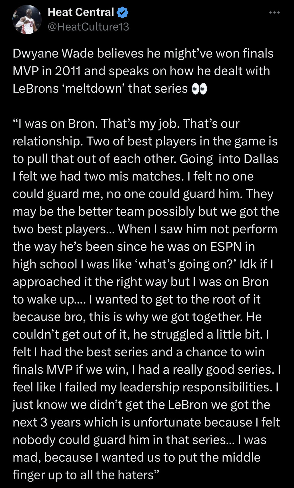 드웨인 웨이드는 자신이 2011년 파이널 MVP를 수상할수도 있었다고 믿으며, 당시 르브론의 '멘탈 붕괴'에 어떻게 대처했는지에 대해 이야기했습니다. 👀