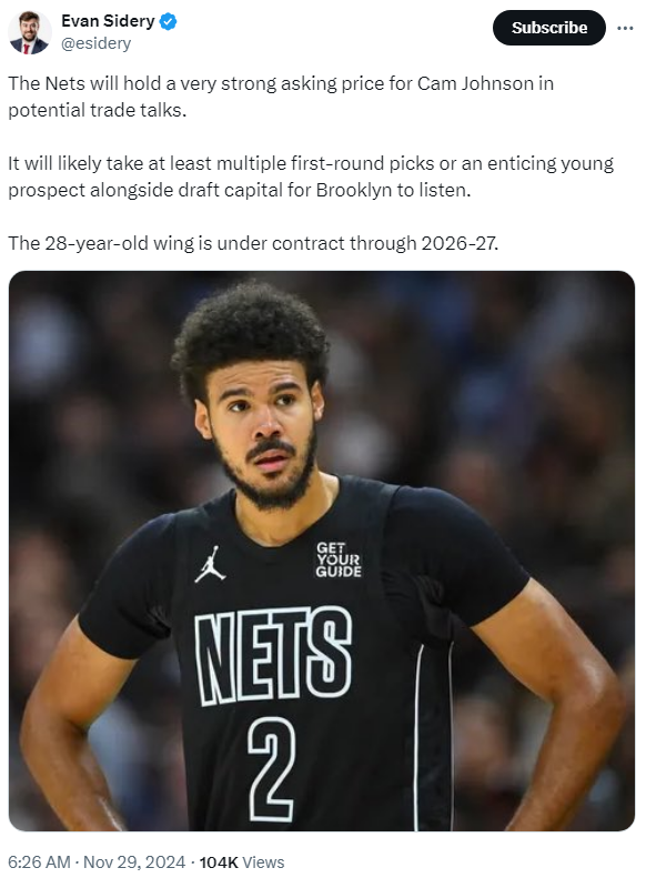 [BKN]캠 존슨의 잠재적인 트레이드 협상에서 상당히 높은 가격을 유지할 것으로 보이는 브루클린 네츠 작성자Melo|작성시간24.11.29|조회수472 목록 댓글 3 글자크기 작게가 글자크기 크게가 브루클린과 대화를 하기 위해서는 적어도 여러 개의 1라운드 픽이나 드래프트픽 + 젊은 유망주가 필요할 것임. 28살의 캠 존슨은 26-27시즌까지 계약이 남음.https://x.com/esidery/status/1862246738414694403 다음검색 현재 게시글 추가 기능 열기 북마크 공유하기 신고 센터로 신고 댓글 댓글 3 댓글쓰기 답글쓰기 댓글 리스트 작성자어빙신 | 작성시간 24.11.29 우승팀 3옵션 가나?!?! 작성자(CHI)불타는개고기 | 작성시간 24.11.29 요즘 폼이 좋긴한데 과연 어디로 작성자데미아니 | 작성시간 24.11.29 그렇게 배짱부리면 못 팔고 똥값됨. 댓글 전체보기