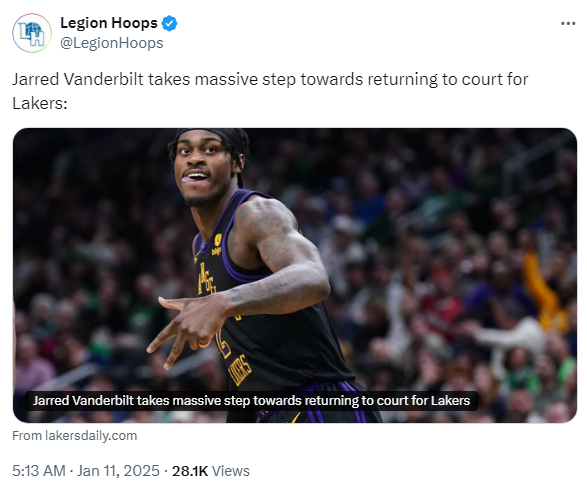 [LAL]재활 중인 제러드 밴더빌트는 G리그에 배정되었고 곧 복귀할 것으로 보임 작성자Melo|작성시간25.01.11|조회수179 목록 댓글 1 글자크기 작게가 글자크기 크게가 풀코트 활동을 허가 받았으며 재평가가 곧 이뤄질 예정.https://x.com/LegionHoops/status/1877810981356601459 다음검색 현재 게시글 추가 기능 열기 북마크 공유하기 신고 센터로 신고 댓글 댓글 1 댓글쓰기 답글쓰기 댓글 리스트 작성자Spot-Up | 작성시간 25.01.11 진또배기 수비 부탁헌다 댓글 전체보기