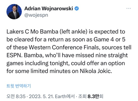 [LAL] 모 밤바, Nuggets와의 4차전 혹은 5차전 복귀할 것으로 예상됨 (워즈) 작성자(CHI)불타는개고기|작성시간23.05.21|조회수487 목록 댓글 0 글자크기 작게가 글자크기 크게가 왼쪽 발목 부상으로 오늘 경기 포함9경기 연속 결장 중 다음검색 현재 게시글 추가 기능 열기 북마크 공유하기 신고 센터로 신고 댓글 댓글 0 댓글쓰기 답글쓰기 댓글 리스트