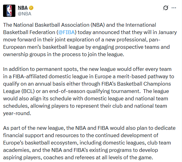아울러 NBA와 FIBA는 이 신규 리그의 일환으로, 유럽 농구 생태계의 지속적인 발전을 위해 재정적 지원과 다양한 자원을 투입할 계획이다. 여기에는 각국 국내 리그, 클럽 유소년 아카데미, 그리고 유망 선수·지도자·심판 육성을 위한 NBA와 FIBA의 기존 프로그램 전반이 포함된다.