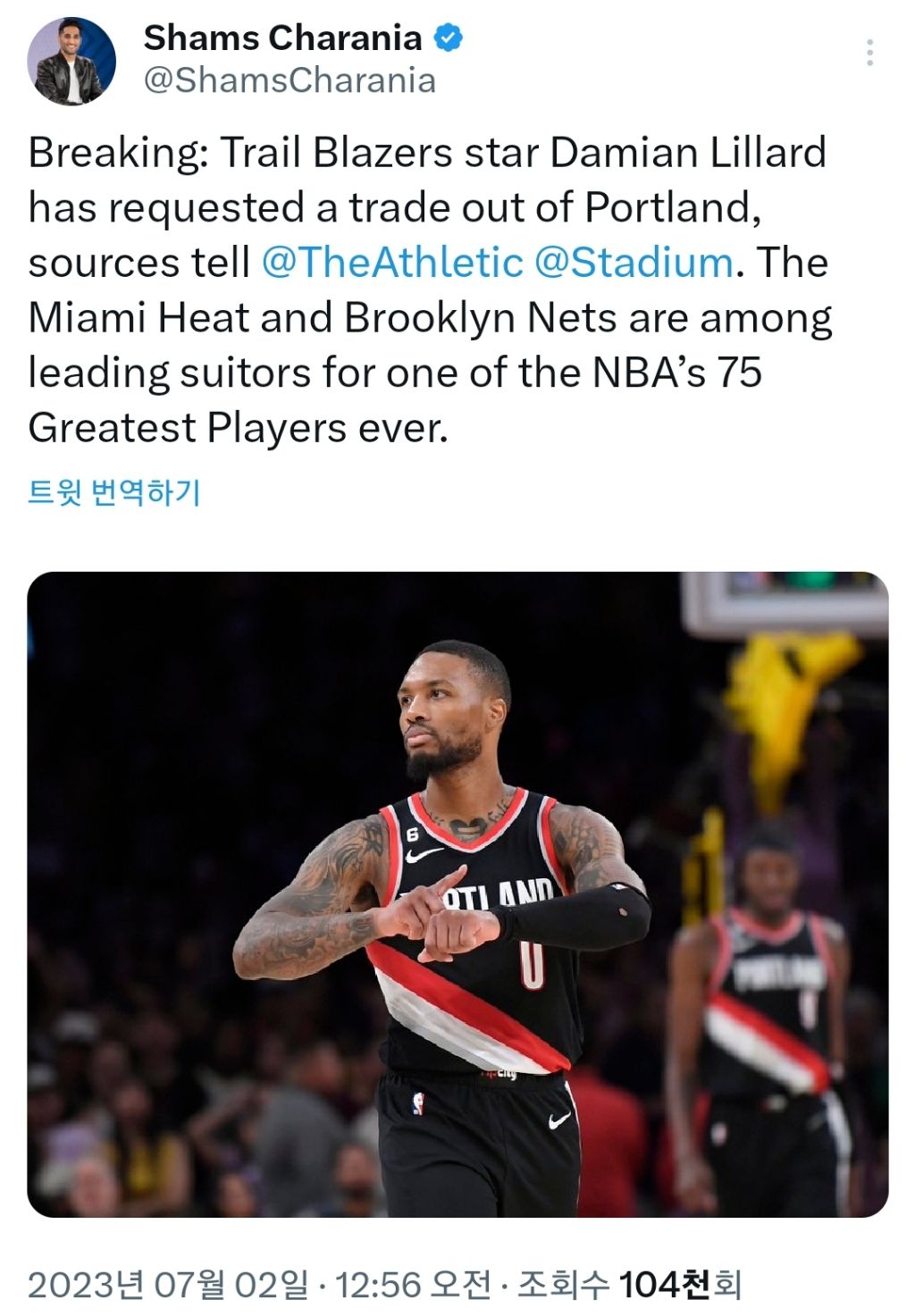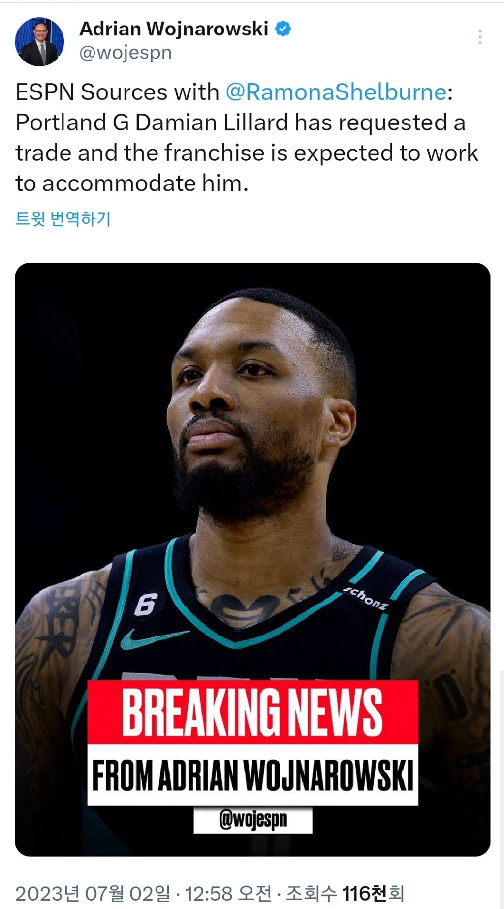 구단에 트레이드 요청을 한 데미안 릴라드, 마이애미와 브루클린이 후보 헹선지 작성자샌반야마|작성시간23.07.02|조회수1,672 목록 댓글 18 글자크기 작게가 글자크기 크게가 포틀랜드는 이를 수용하기 위해 노력할 것이며마이애미와 브루클린이 후보 다음검색 현재 게시글 추가 기능 열기 북마크 공유하기 신고 센터로 신고 댓글 댓글 18 댓글쓰기 답글쓰기 댓글 리스트 작성자풀코트프레스 | 작성시간 23.07.02 릴라드로 뜯어내면 포틀 전력이...ㅎㄷㄷ 작성자스타매니야당 | 작성시간 23.07.02 릴라드때문에 디아할때 자꾸 릴라트라고합니다 작성자DeeKeiy🎗 | 작성시간 23.07.02 필라에 갈 생각은 없는가 자네? 작성자Spot-Up | 작성시간 23.07.02 결국.. 원클럽맨을 못하는군요.. 릴 낭만있었다 작성자YKWTII | 작성시간 23.07.02 행복하길.. 댓글 전체보기