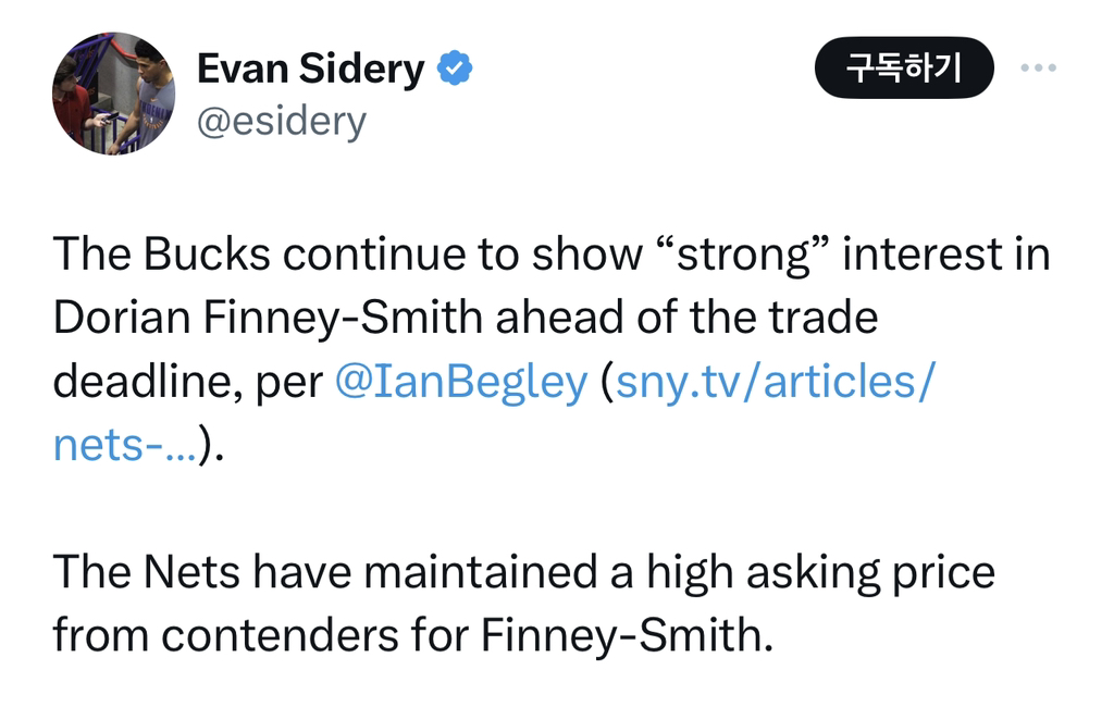 The Bucks continue to show “strong” interest in Dorian Finney-Smith ahead of the trade deadline, per @IanBegley (https://t.co/djfjQwgVhi). The Nets have maintained a high asking price from contenders for Finney-Smith.