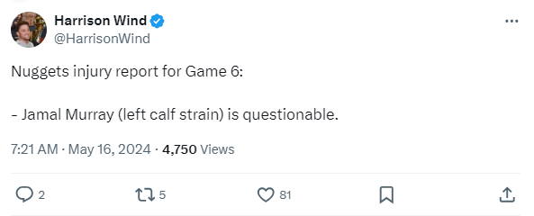 [DEN]자말 머레이 - 왼쪽 종아리 염좌로 내일 미네소타와의 6차전 Questionable 작성자Melo|작성시간24.05.16|조회수136 목록 댓글 0 글자크기 작게가 글자크기 크게가 https://twitter.com/HarrisonWind/status/1790870123156246942 다음검색 현재 게시글 추가 기능 열기 북마크 공유하기 신고 센터로 신고 댓글 댓글 0 댓글쓰기 답글쓰기 댓글 리스트