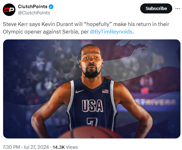 케빈 듀란트의 내일 세르비아전 출전이 희망적이라고 말한 스티브 커 감독 작성자Melo|작성시간24.07.27|조회수309 목록 댓글 0 글자크기 작게가 글자크기 크게가 긍정의 의미인지, 나오기를 희망한다는건지 정확히 모르겠네요..https://x.com/ClutchPoints/status/1817145629426303384 다음검색 현재 게시글 추가 기능 열기 북마크 공유하기 신고 센터로 신고 댓글 댓글 0 댓글쓰기 답글쓰기 댓글 리스트