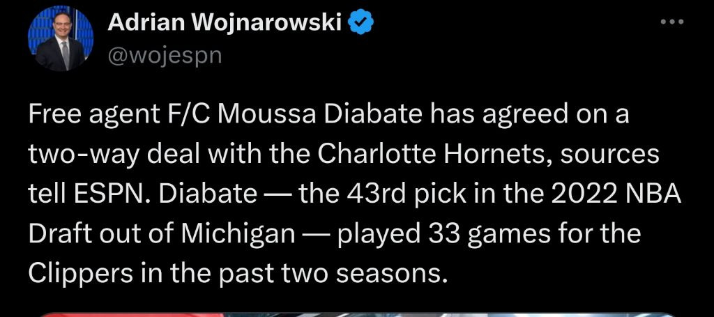 Free agent F/C Moussa Diabate has agreed on a two-way deal with the Charlotte Hornets, sources tell ESPN. Diabate — the 43rd pick in the 2022 NBA Draft out of Michigan — played 33 games for the Clippers in the past two seasons.