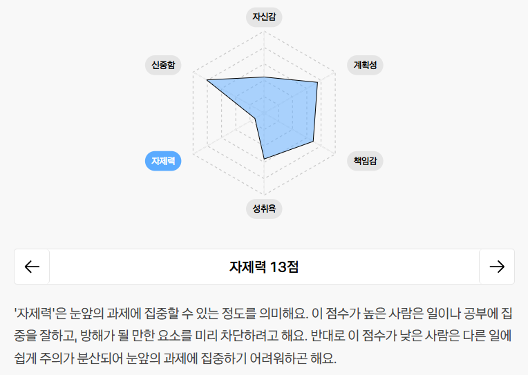 작성자SenesQ 작성시간 26.01.28 난가? 하고 해봤더니 성취욕이 31점이라 역시 내 얘기인가보군! 근데 자제력이 6점이네요. ㅎㅎㅎㅎ