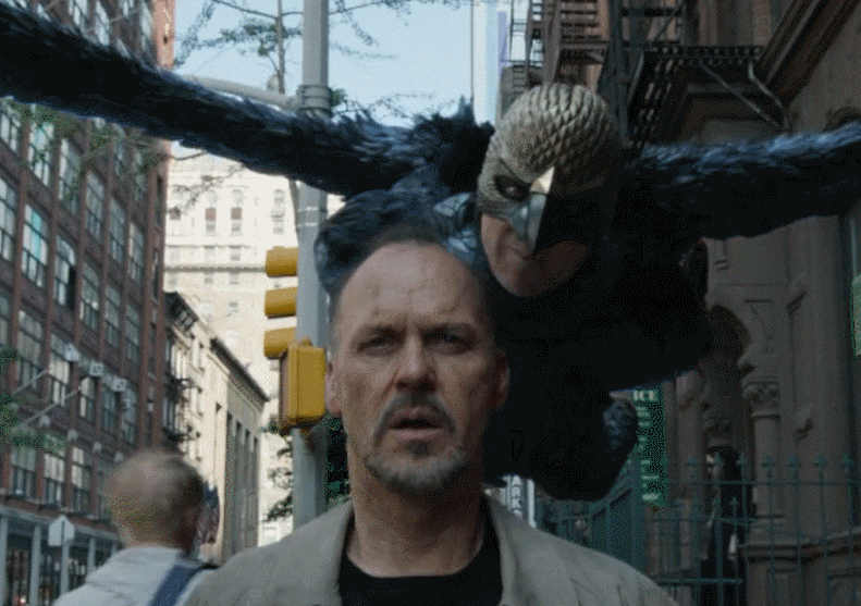 <버드맨>은 전체가 16개의 숏으로 이루어져 있는데, 오프닝의 짧은 숏 3개와 후반의 중요한 사건직후 11개의 숏이 터져나오는 부분을 제외한 전체가 롱테이크처럼 연출되어 있으며 단조로운 롱테이크가 아니라 시종일관 온갖 장소를 넘나들며 화려한 움직임을 보여줍니다. 이 때문에 이동진 영화 평론가는 '끊어지기 직전의 외줄 위에서 펼치는 현란한 영화적 곡예'라는 20자평을 했습니다.