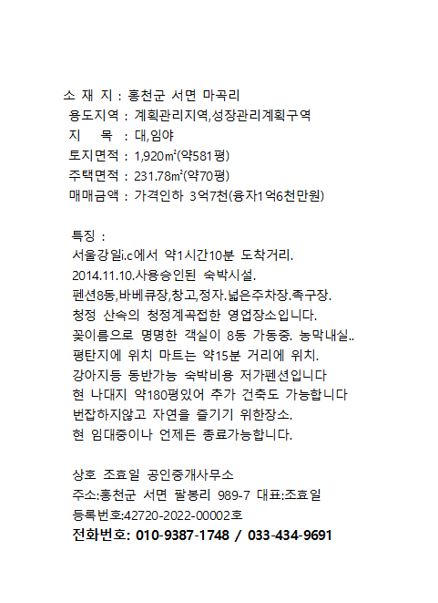 홍천 서면 청정산속 냇가접 8동의 저가형펜션 3억7천만원(융자1.6억포함가) 작성자효일공인|작성시간26.03.30|조회수13 목록 댓글 0 글자크기 작게가 글자크기 크게가 다음검색 현재 게시글 추가 기능 열기 북마크 신고 센터로 신고 댓글 댓글 0 댓글쓰기 답글쓰기 댓글 리스트