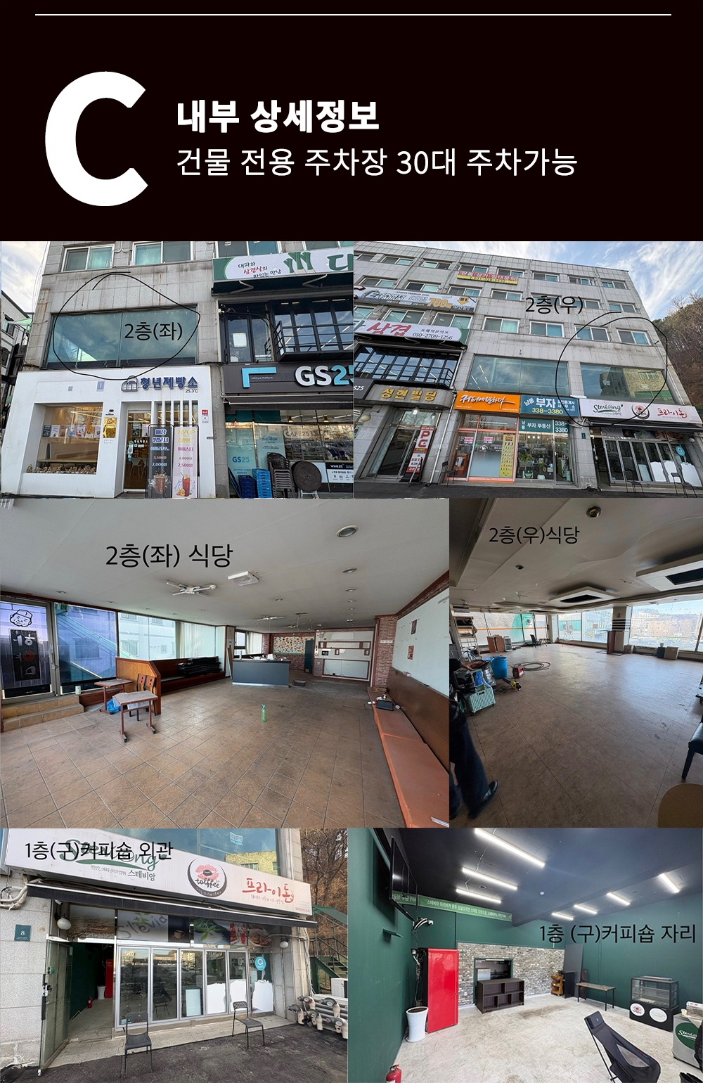 | 면적 | 전용면적 지상 1층 15평 기존 카페자리 - 보 2000 / 월 150 지상 2층 31평 - 보 3000 / 월 150 지상 2층 34평 - 보 3000 / 월 170 지하 1층 60평 노래방 / 시설 그대로 이용 가능 - 보 4000 / 월 180 지하 1층 70평 구)당구장 - 보 4000 / 월 150 |