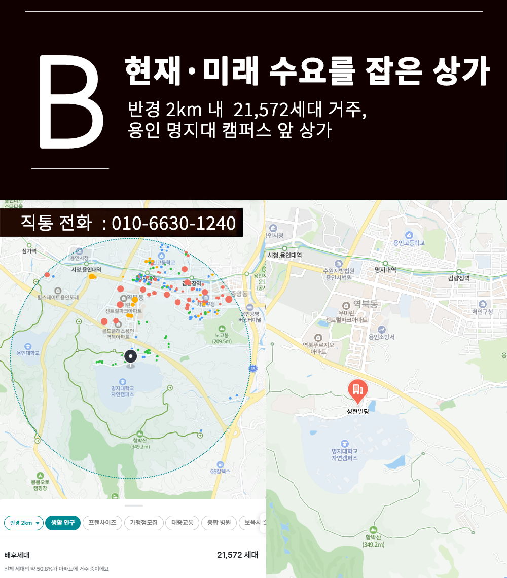 | 추가사항 | 명지대학교 정문 1분거리의 상가로, 건물 내 피시방과 베이커리 카페, 고깃집, 편의점이 입점되어있는 상태이며, PC방은 항상 만석에 가깝고, 카페와 편의점 모두 유동 인구가 꾸준히 많은 편입니다. 건물 내 원룸 45실 모두 만실이며, 건물 앞 마당에 30대의 차량을 주차할 수 있습니다. - 인근 1.5km 이내 12,930세대의 거주세대가 잡히고, 추가 4,700세대의 아파트 개발이 진행중으로, 이에따른 외부수요를 확보할 수 있습니다. |