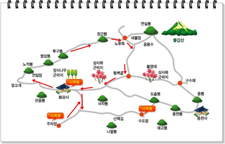 | 코스 | 주차장→노적봉→노루목→ 동백골 →주차장 |