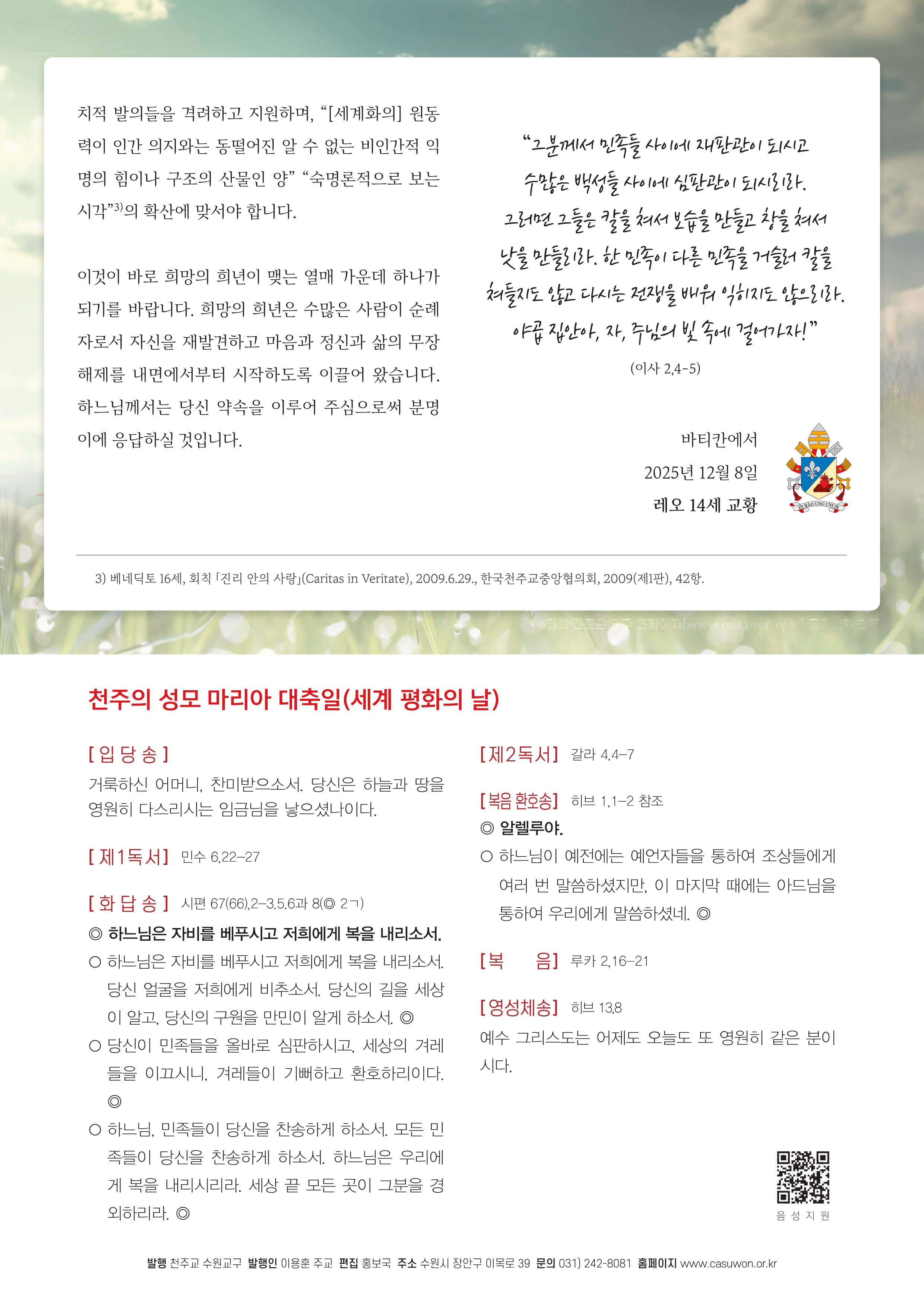 2026년 1월 1일 천주의 성모 마리아 대축일 작성자박태화 안나|작성시간26.01.01|조회수41 목록 댓글 0 글자크기 작게가 글자크기 크게가 다음검색 현재 게시글 추가 기능 열기 북마크 공유하기 신고 센터로 신고 댓글 댓글 0 댓글쓰기 댓글 리스트