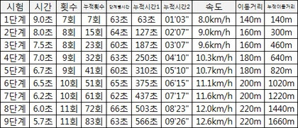 왕복 오래 달리기 (회) | 남 | 57~ 59 | 60~ 61 | 62~ 63 | 64~ 67 | 68~ 71 | 72~ 74 | 75 | 76 | 77 | 78 이상 |