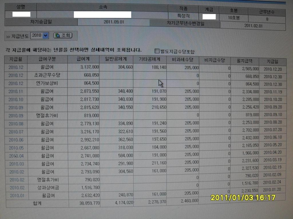 제 개인 급여 명세서 사진입니다.