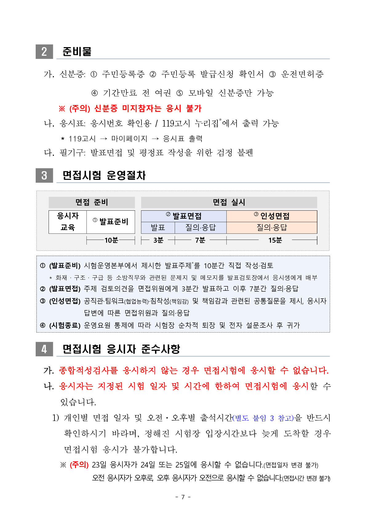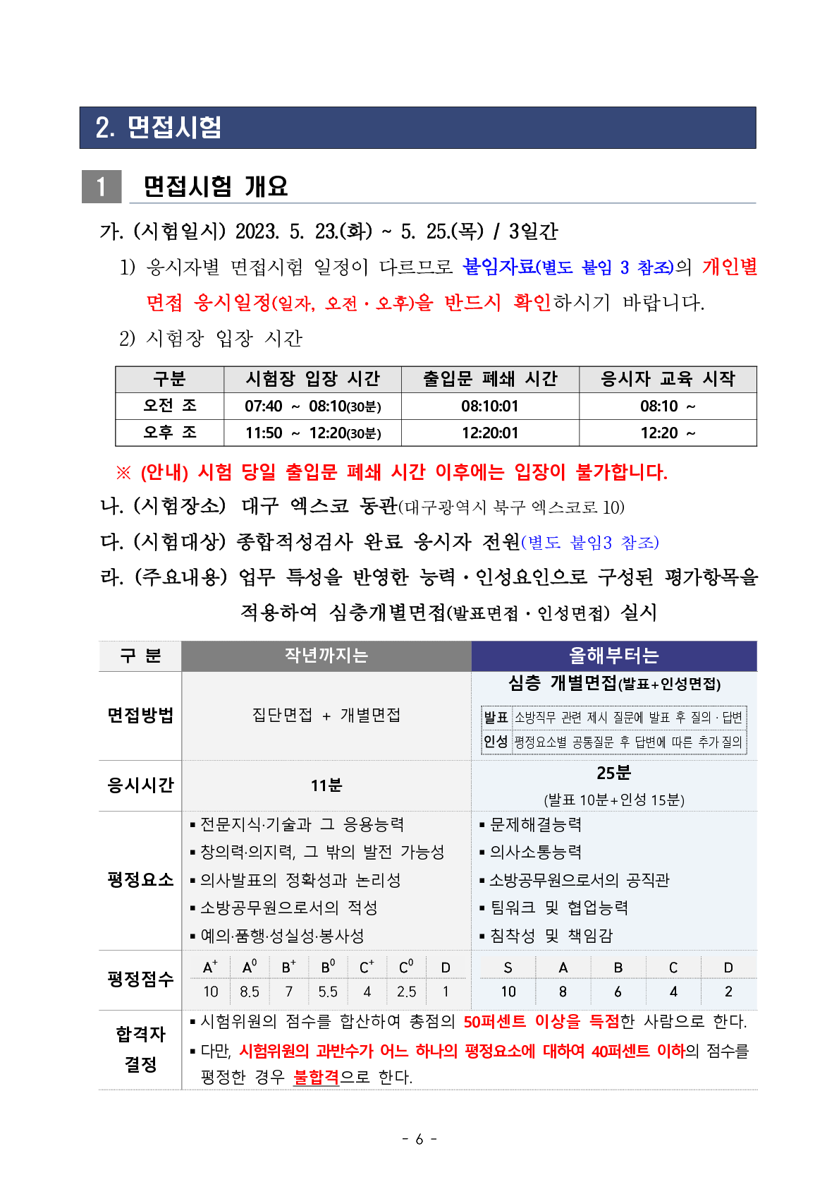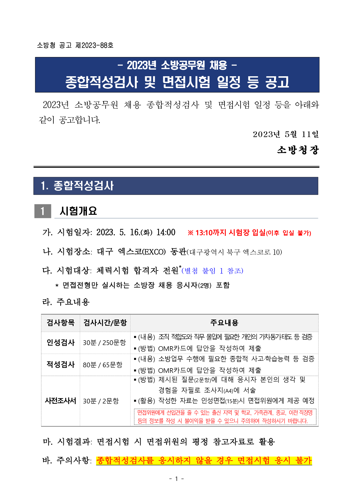 2023년 소방공무원 채용 종합적성검사 및 면접시험 일정 등 공고 작성자김태준|작성시간23.05.12|조회수3,643 목록 댓글 0 글자크기 작게가 글자크기 크게가 1.+2023년+소방공무원+채용+종합적성검사+및+면접시험+일정+등+공고.pdf654.98KB2.+(별도+붙임+1)+종합적성검사+좌석배치표(공고용).pdf260.13KB3.+(별도+붙임+2)+종합적성검사+시험장+안내도.pdf269.26KB4.+(별도+붙임+3)+면접시험+응시자+조편성+현황(공고용).pdf455.61KB5-1.+(별도+붙임+4-2)+면접시험장+안내도(오후조+참고).pdf183.34KB5.+(별도+붙임+4-1)+면접시험장+안내도(오전조+참고).pdf167.74KB6.+(별첨+1,2,3,4)+엑스코+위치,+주차장+및+셔틀버스+정보.pdf579.51KB7.+(별첨+5)+답안지+등+서식+참고자료(견본).pdf1.48MB8.+(별첨+6)+2023+소방공무원+면접시험+응시요령.mp44.56MB 📢 정보에 도움이 되셨다면 '댓글'✍🏻과 '추천해요'👍를 부탁합니다. 첨부파일첨부된 파일이 19개 있습니다. png 파일 1.+2023년+소방공무원+채용+종합적성검사+및+면접시험+일정+등+공고_4.png 다운로드 png 파일 1.+2023년+소방공무원+채용+종합적성검사+및+면접시험+일정+등+공고_6.png 다운로드 png 파일 1.+2023년+소방공무원+채용+종합적성검사+및+면접시험+일정+등+공고_1.png 다운로드 png 파일 1.+2023년+소방공무원+채용+종합적성검사+및+면접시험+일정+등+공고_2.png 다운로드 png 파일 1.+2023년+소방공무원+채용+종합적성검사+및+면접시험+일정+등+공고_3.png 다운로드 png 파일 1.+2023년+소방공무원+채용+종합적성검사+및+면접시험+일정+등+공고_5.png 다운로드 png 파일 1.+2023년+소방공무원+채용+종합적성검사+및+면접시험+일정+등+공고_8.png 다운로드 png 파일 1.+2023년+소방공무원+채용+종합적성검사+및+면접시험+일정+등+공고_7.png 다운로드 png 파일 1.+2023년+소방공무원+채용+종합적성검사+및+면접시험+일정+등+공고_9.png 다운로드 png 파일 1.+2023년+소방공무원+채용+종합적성검사+및+면접시험+일정+등+공고_10.png 다운로드 pdf 파일 1.+2023년+소방공무원+채용+종합적성검사+및+면접시험+일정+등+공고.pdf 다운로드 pdf 파일 2.+(별도+붙임+1)+종합적성검사+좌석배치표(공고용).pdf 다운로드 pdf 파일 3.+(별도+붙임+2)+종합적성검사+시험장+안내도.pdf 다운로드 pdf 파일 4.+(별도+붙임+3)+면접시험+응시자+조편성+현황(공고용).pdf 다운로드 pdf 파일 5-1.+(별도+붙임+4-2)+면접시험장+안내도(오후조+참고).pdf 다운로드 pdf 파일 6.+(별첨+1,2,3,4)+엑스코+위치,+주차장+및+셔틀버스+정보.pdf 다운로드 pdf 파일 5.+(별도+붙임+4-1)+면접시험장+안내도(오전조+참고).pdf 다운로드 pdf 파일 7.+(별첨+5)+답안지+등+서식+참고자료(견본).pdf 다운로드 mp4 파일 8.+(별첨+6)+2023+소방공무원+면접시험+응시요령.mp4 다운로드 다음검색 현재 게시글 추가 기능 열기 북마크 공유하기 신고 센터로 신고 댓글 댓글 0 댓글쓰기 답글쓰기 댓글 리스트