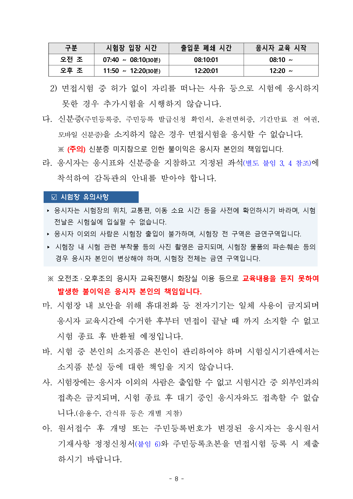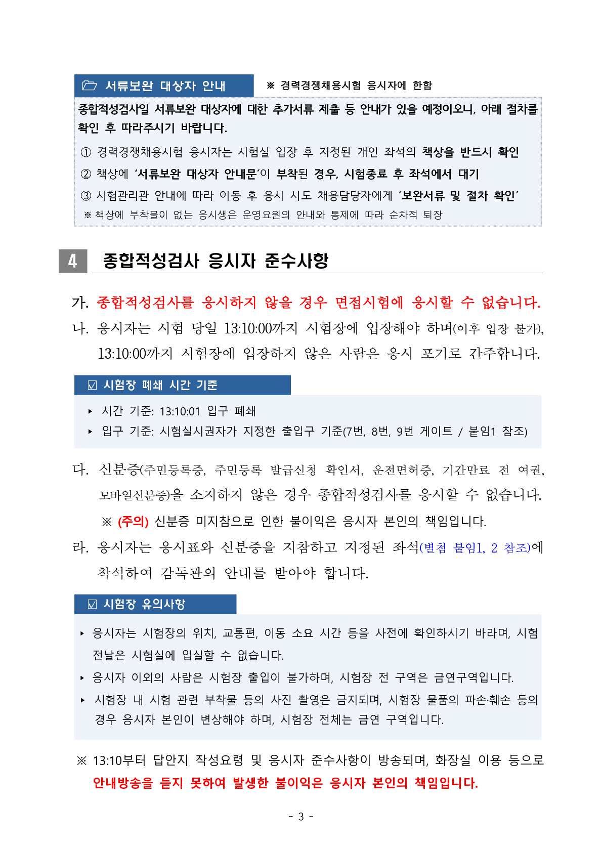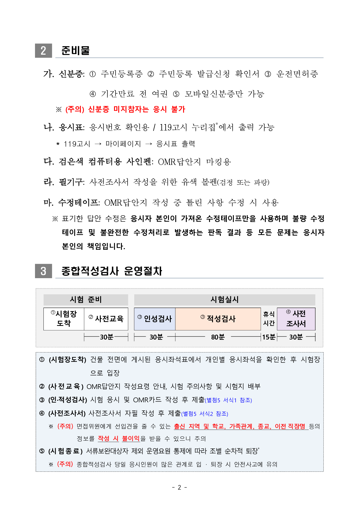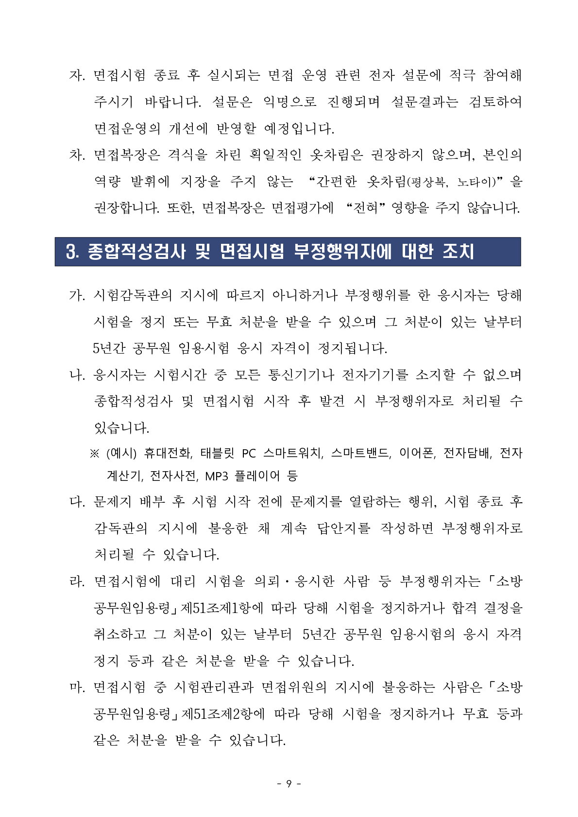 2023년 소방공무원 채용 종합적성검사 및 면접시험 일정 등 공고 작성자김태준|작성시간23.05.12|조회수3,643 목록 댓글 0 글자크기 작게가 글자크기 크게가 1.+2023년+소방공무원+채용+종합적성검사+및+면접시험+일정+등+공고.pdf654.98KB2.+(별도+붙임+1)+종합적성검사+좌석배치표(공고용).pdf260.13KB3.+(별도+붙임+2)+종합적성검사+시험장+안내도.pdf269.26KB4.+(별도+붙임+3)+면접시험+응시자+조편성+현황(공고용).pdf455.61KB5-1.+(별도+붙임+4-2)+면접시험장+안내도(오후조+참고).pdf183.34KB5.+(별도+붙임+4-1)+면접시험장+안내도(오전조+참고).pdf167.74KB6.+(별첨+1,2,3,4)+엑스코+위치,+주차장+및+셔틀버스+정보.pdf579.51KB7.+(별첨+5)+답안지+등+서식+참고자료(견본).pdf1.48MB8.+(별첨+6)+2023+소방공무원+면접시험+응시요령.mp44.56MB 📢 정보에 도움이 되셨다면 '댓글'✍🏻과 '추천해요'👍를 부탁합니다. 첨부파일첨부된 파일이 19개 있습니다. png 파일 1.+2023년+소방공무원+채용+종합적성검사+및+면접시험+일정+등+공고_4.png 다운로드 png 파일 1.+2023년+소방공무원+채용+종합적성검사+및+면접시험+일정+등+공고_6.png 다운로드 png 파일 1.+2023년+소방공무원+채용+종합적성검사+및+면접시험+일정+등+공고_1.png 다운로드 png 파일 1.+2023년+소방공무원+채용+종합적성검사+및+면접시험+일정+등+공고_2.png 다운로드 png 파일 1.+2023년+소방공무원+채용+종합적성검사+및+면접시험+일정+등+공고_3.png 다운로드 png 파일 1.+2023년+소방공무원+채용+종합적성검사+및+면접시험+일정+등+공고_5.png 다운로드 png 파일 1.+2023년+소방공무원+채용+종합적성검사+및+면접시험+일정+등+공고_8.png 다운로드 png 파일 1.+2023년+소방공무원+채용+종합적성검사+및+면접시험+일정+등+공고_7.png 다운로드 png 파일 1.+2023년+소방공무원+채용+종합적성검사+및+면접시험+일정+등+공고_9.png 다운로드 png 파일 1.+2023년+소방공무원+채용+종합적성검사+및+면접시험+일정+등+공고_10.png 다운로드 pdf 파일 1.+2023년+소방공무원+채용+종합적성검사+및+면접시험+일정+등+공고.pdf 다운로드 pdf 파일 2.+(별도+붙임+1)+종합적성검사+좌석배치표(공고용).pdf 다운로드 pdf 파일 3.+(별도+붙임+2)+종합적성검사+시험장+안내도.pdf 다운로드 pdf 파일 4.+(별도+붙임+3)+면접시험+응시자+조편성+현황(공고용).pdf 다운로드 pdf 파일 5-1.+(별도+붙임+4-2)+면접시험장+안내도(오후조+참고).pdf 다운로드 pdf 파일 6.+(별첨+1,2,3,4)+엑스코+위치,+주차장+및+셔틀버스+정보.pdf 다운로드 pdf 파일 5.+(별도+붙임+4-1)+면접시험장+안내도(오전조+참고).pdf 다운로드 pdf 파일 7.+(별첨+5)+답안지+등+서식+참고자료(견본).pdf 다운로드 mp4 파일 8.+(별첨+6)+2023+소방공무원+면접시험+응시요령.mp4 다운로드 다음검색 현재 게시글 추가 기능 열기 북마크 공유하기 신고 센터로 신고 댓글 댓글 0 댓글쓰기 답글쓰기 댓글 리스트