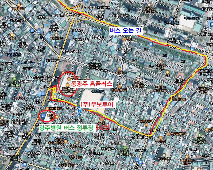 | 09:45 동광주 홈플러스 | 버스 노선: 6번, 47번, 518번, 87번,187번, 181번,23번,86번,55번,74번, 303번,311번 |