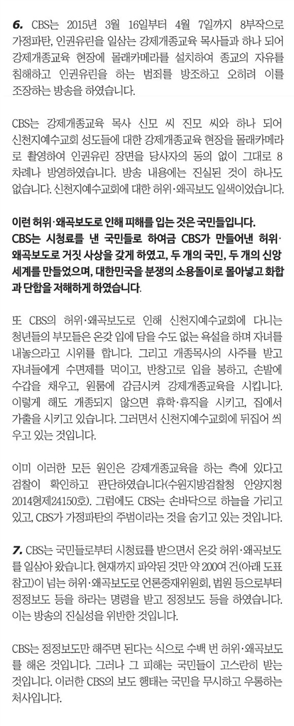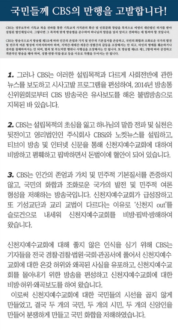 이에 CBS의 만행을 고발하는 성명서를 발표하며 CBS폐쇄를 촉구합니다!