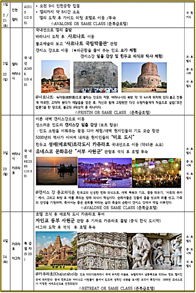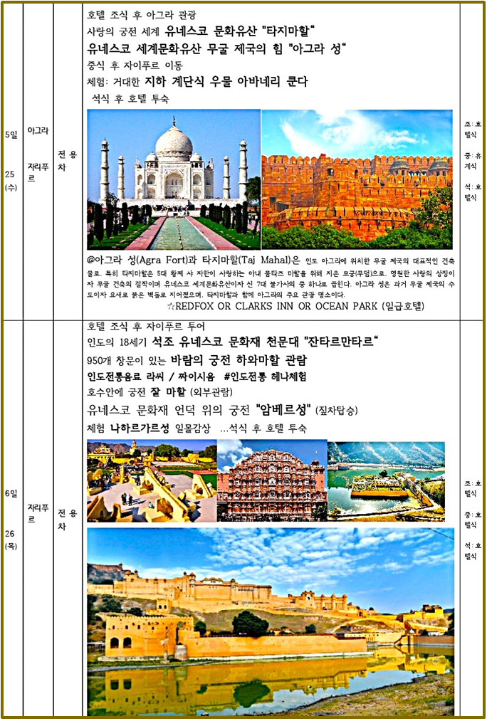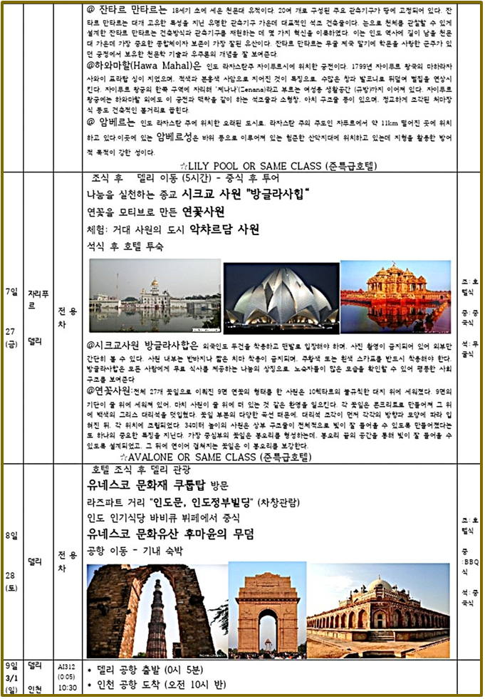 | * 여행지 | 인도북부 6개도시 (세계문화유산 - 5군데)ㅡ아래 일정표 참조 |