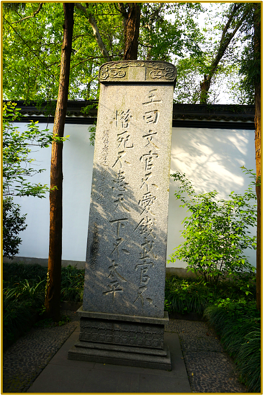 악비의 사당과 무덤은 ‘악왕묘(岳王廟)’라는 세로 현판이 걸린 정문으로부터 시작된다. 전반부는 사당과 전시실이고 왼쪽으로 악비와 아들 악운(岳雲)의 무덤이 있다. 그런데 사당을 지나 무덤으로 가는 길에 주의하지 않으면 그냥 지나치기 십상인 비석이 하나 있다. 이름 하여 ‘악비고언비(岳飛苦言碑)’이다.