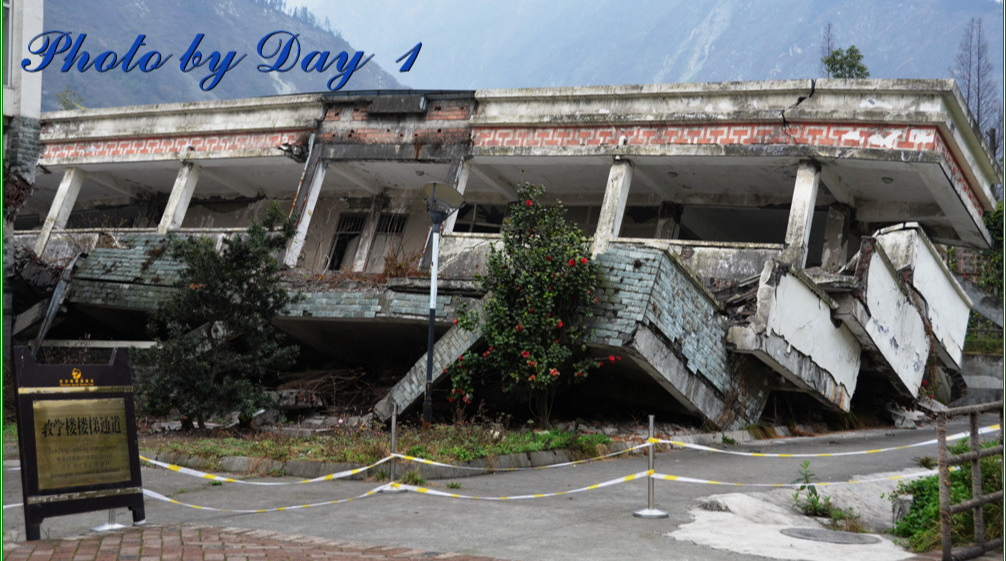 거의 복구가 되었지만 지진의 흔적은 남아 있으며, 무너진 가옥이나 담 그리고 바위에는 ‘5‧12 汶