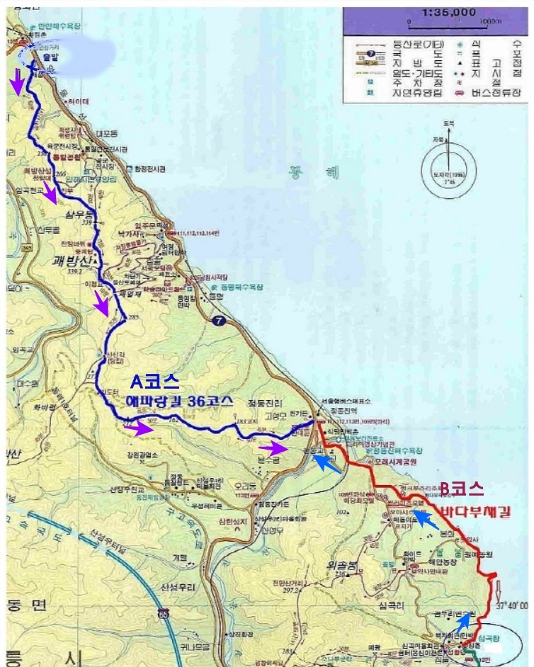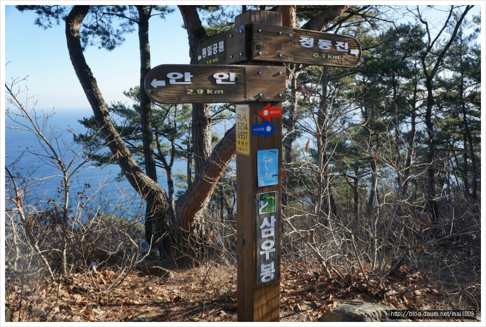 3.산행코스 : A코스 : 안인주차장-164봉-삼우봉-전망바위-정상-괘일대-당집-183봉-정동진