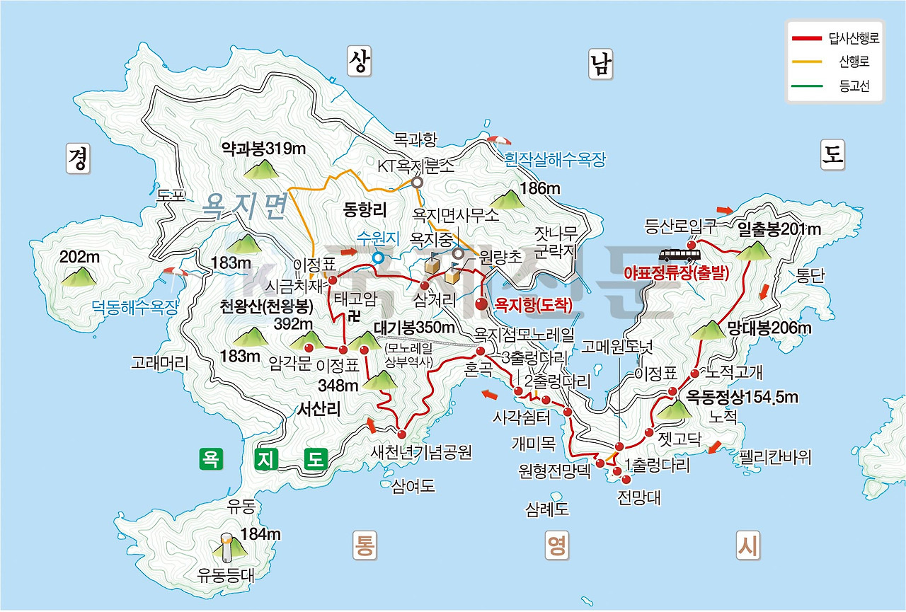 통영에서 남쪽으로 30㎞ 거리에 위치한 욕지도는 12개 유인도와 30개 무인도를 거느린 큰 섬이다. 연화도, 상노대도, 하노대도, 초도 등 크고 작은 섬이 모인 욕지면의 본섬으로 먼 바다의 거친 파도를 막아내면서도 안으로는 잔잔한 물결을 이루고 있다.욕지(欲知)라는 이름은 어떤 노승이 제자에게 "알고자 하거든 석가세존을 본받으라"고 말하며 욕지도를 가리킨 데서 비롯된다. 욕지도는 연화대사의 시신이 한 송이 연꽃으로 승화되었다고 전해지는 연화도와 함께 불교와 인연이 깊은 섬으로 여겨진다.거제도와 한산도를 멀리 바라보고 있는 욕지도는 예부터 전략적 요충지로 손꼽혔다. 임진왜란 직후 삼도수군통제영이 설치되면서 통제영에 속한 사량진, 당포진, 삼천진 등의 변방 수색 및 정박처 역할을 담당했다.한편 욕지도는 남해 외해와 내해가 만나는 곳이다 보니 자연스레 어장이 발달했다. 1970년대까지 남해안의 어업전진기지로 어획물의 매매가 이루어지는 파시가 들어설 만큼 위세가 대단했다. 욕지도 여행의 가장 큰 매력은 해안도로 일주와 천황봉 트레킹에 있다. 21㎞ 길이의 해안도로는 산허리를 부드럽게 휘감아 내리는데 최근 들어 산악자전거, 섬 마라톤 코스로 활용되고 있을 정도로 인기가 좋다. 천황봉 트레킹은 섬 동쪽 끝 일출봉에서 시작해 망대봉ㆍ옥동정상ㆍ대기봉ㆍ천황봉ㆍ수원지를 경유하는 코스다. 해발 392m의 천황봉 정상을 향해 걷는 동안 사방이 탁 트인 바다와 파도가 부서지는 해안절경을 조감할 수 있다. 코스는 약 12㎞에 4시간 30분 정도가 소요되는데 중간 중간 하산할 수 있는 길이 마련돼 있다. 특히 천황산 등산로 코스는 숲이 울창하게 우거져 있어 산들바람을 만끽할 수 있다.