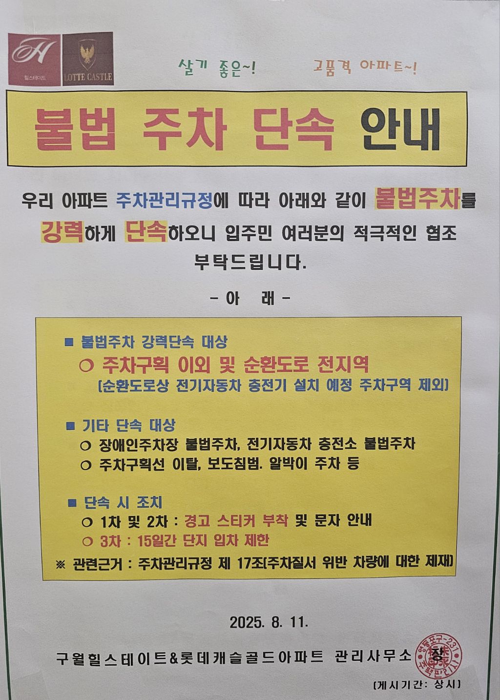 3차 위반시에는 15일간 아파트내 주차 금지라고