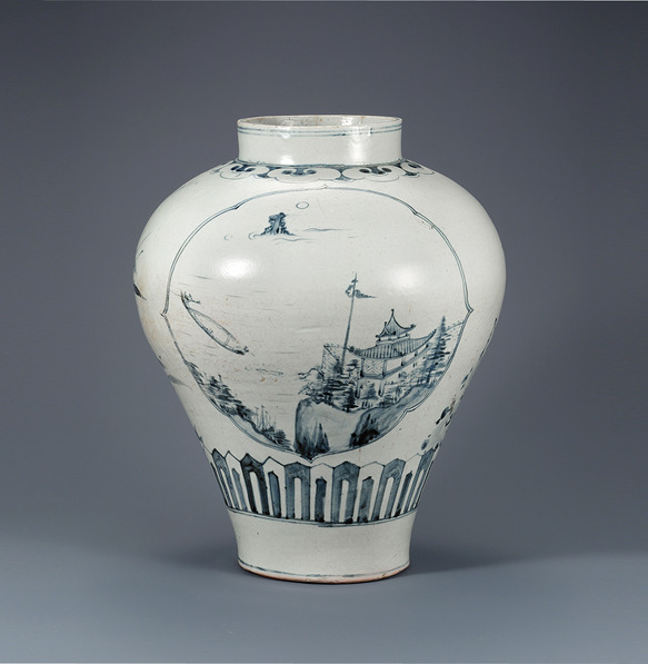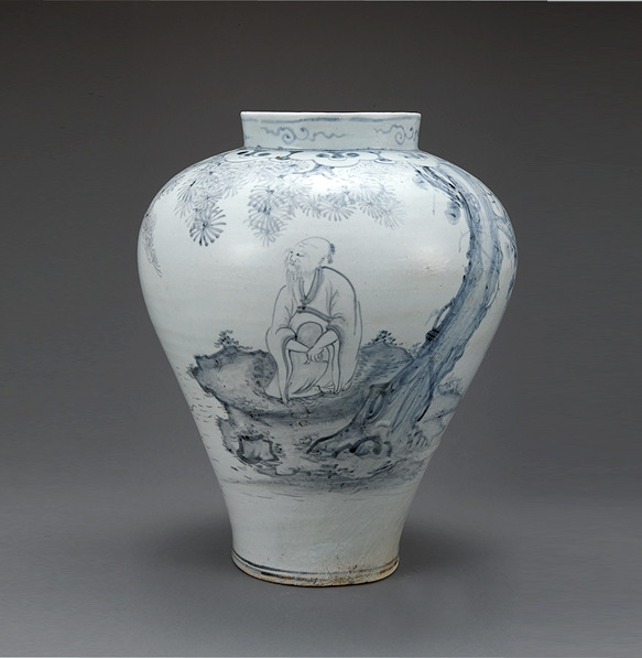 백자청화 수하(樹下)인물무늬 항아리 조선(朝鮮) 18세기 높이 44.5 cm 국립중앙박물관