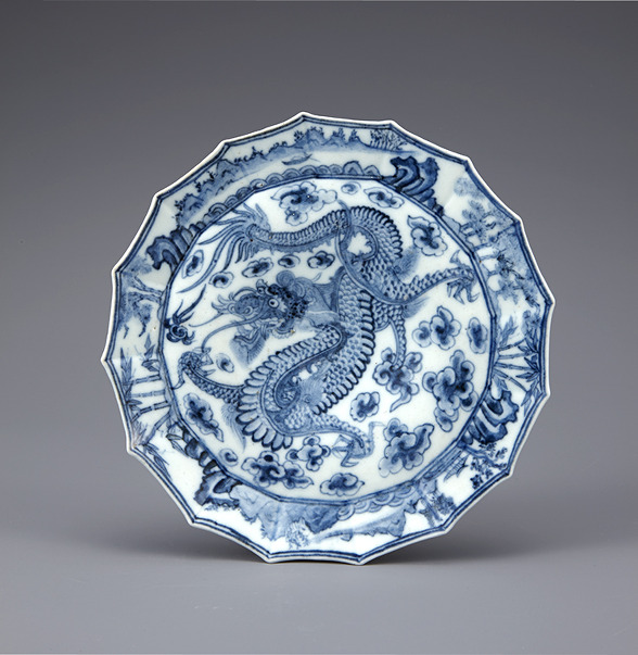 백자청화 '咸豊年製' 명구름용산수무늬 다각접시 조선(朝鮮) 19세기 높이 2.9cm 지름 21.3cm 국립중앙박물관
