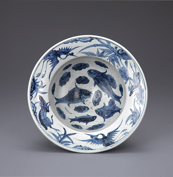 백자청화 십장생어문 '湯之盤' 명대반 조선(朝鮮) 19세기 높이 11.3 cm 국립중앙박물관