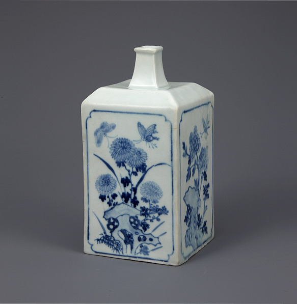 백자청화 괴석풀꽃나비무늬 사각병 조선(朝鮮) 19세기 높이 19.5cm 국립중앙박물관