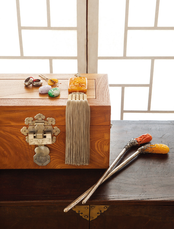 옛 여인들이 생활 속에서 아끼고 애용했던 경대, 빗, 화장품, 유병, 분합, 노리개, 비녀, 뒤꽂이, 가락지와 같은 아름다운 소품에 새긴 무늬는 그저 아름답기만 한 단순한 장식이 아니다. 노리개와 떨잠 등 여인의 장신구에는 나비, 박쥐 등이 많이 쓰이는데, 나비는 기쁨과 행복 그리고 아름다움을, 꽃을 사랑하기 때문에 금슬 좋은 부부애를 의미하고, 박쥐는 한자어 발음인 편복이 복(福)자의 발음과 같다 하여 행복의 상징했다.