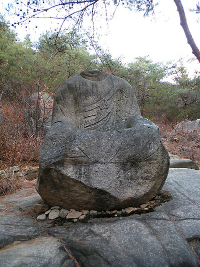 탐방로를 따라 약 300m쯤 들어가면 길 옆 바위 위에 머리없는 석불좌상(石佛坐像)이 앉아 있다.