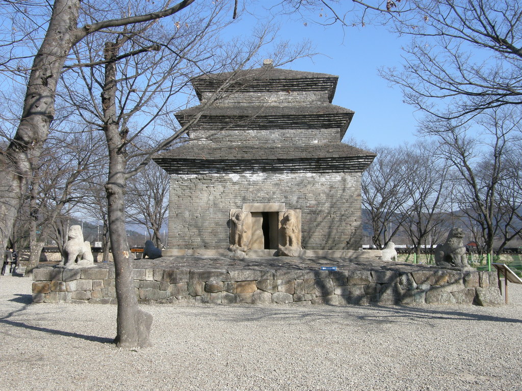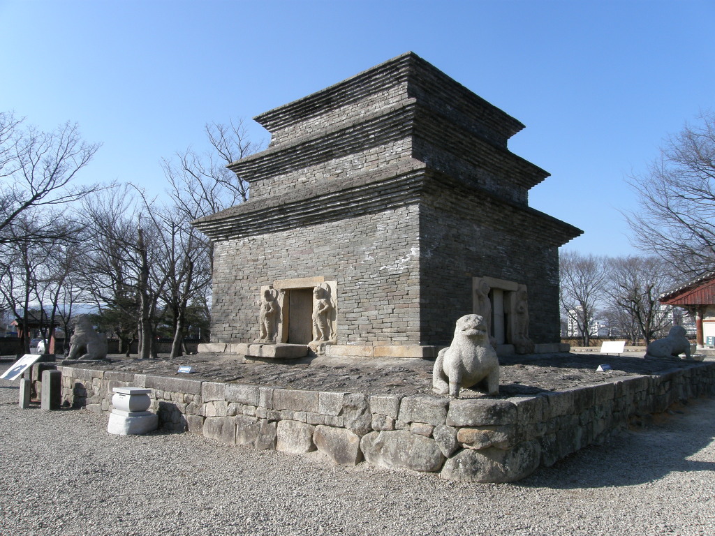 - 국보 30호 분황사 모전석탑의 서쪽면 전경입니다. 선덕여왕 3년(634년)에 쌓아진 것으로 전하는데, 탑신석의 규모로 보아 원래는 8~9층이었을 것으로 추정하고 있습니다. 동서남북 거의 정방향에 위치하며, 사면에 인왕상이 지키는 감실을 두었는데, 지금은 남쪽 감실에만 석불입상이 남아있습니다.