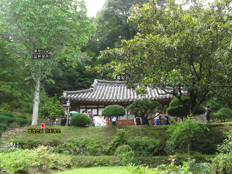 ※ 사실 이 나무는 후박(厚朴)나무가 아니고 일본 목련(日本木蓮)이다. 일본목련은 일본이 원산으로 겨울에 잎이 떨어지는 목련과의 낙엽수이다. 잎이 크고 마른 잎사귀와 꽃에서 향내가 난다하여 '향목련'이라고도 하는데 법정스님이 평소 후박나무라 불러서 지금도 그냥 후박나무라고 한다.