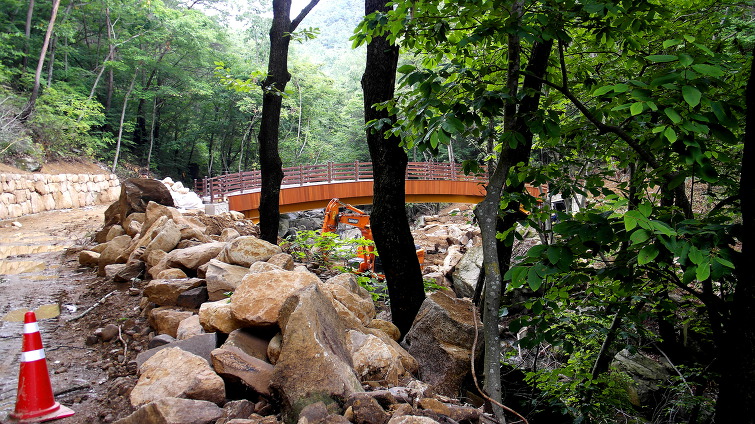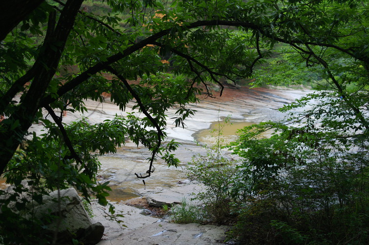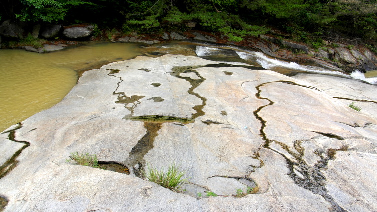 계곡에 흐르는 물이 암반 위를 흘러서 시선을 끈다.