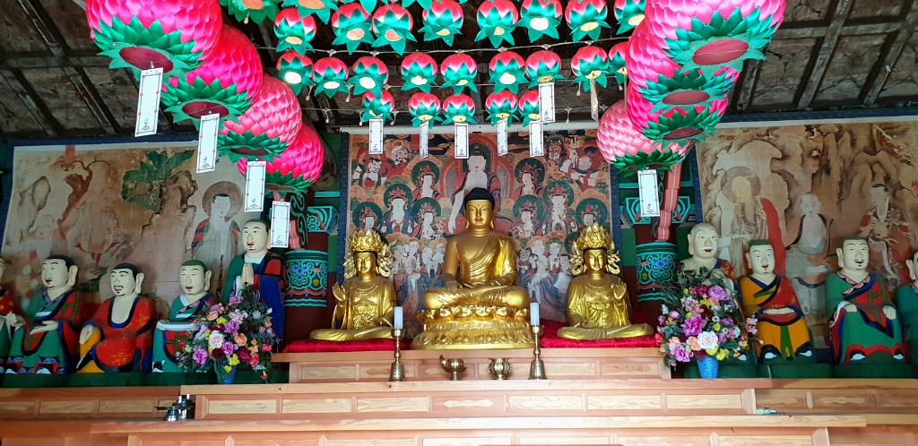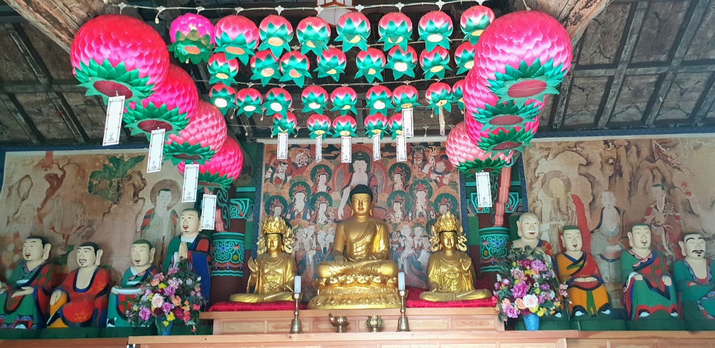 중앙에 주존인 석가모니불은 불상으로 모시고 좌우로 보살상을 모신 후에 나한탱화를 모셨다.