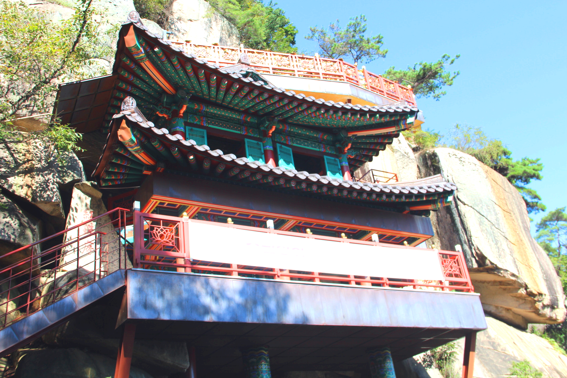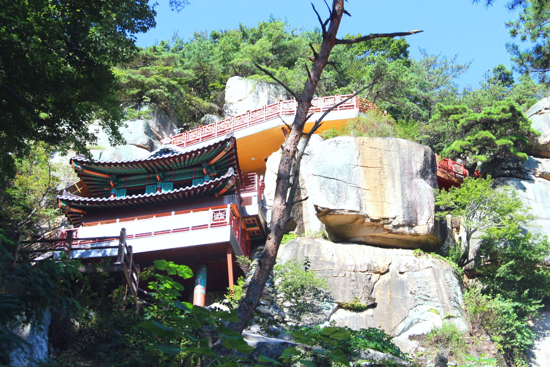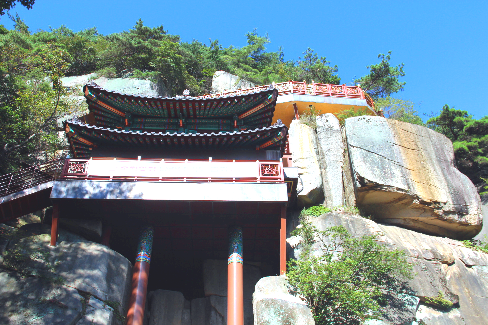 불굴사 옆 소나무 길을 따라 오르면 천년송이 뿌리를 내린 암반에 절묘하게 세워진 홍주암이 있다.