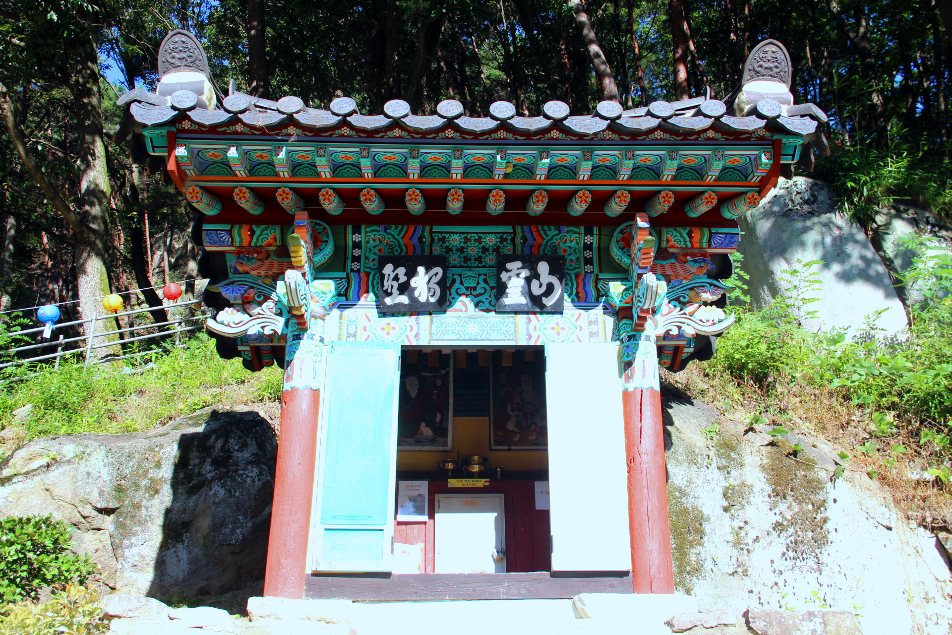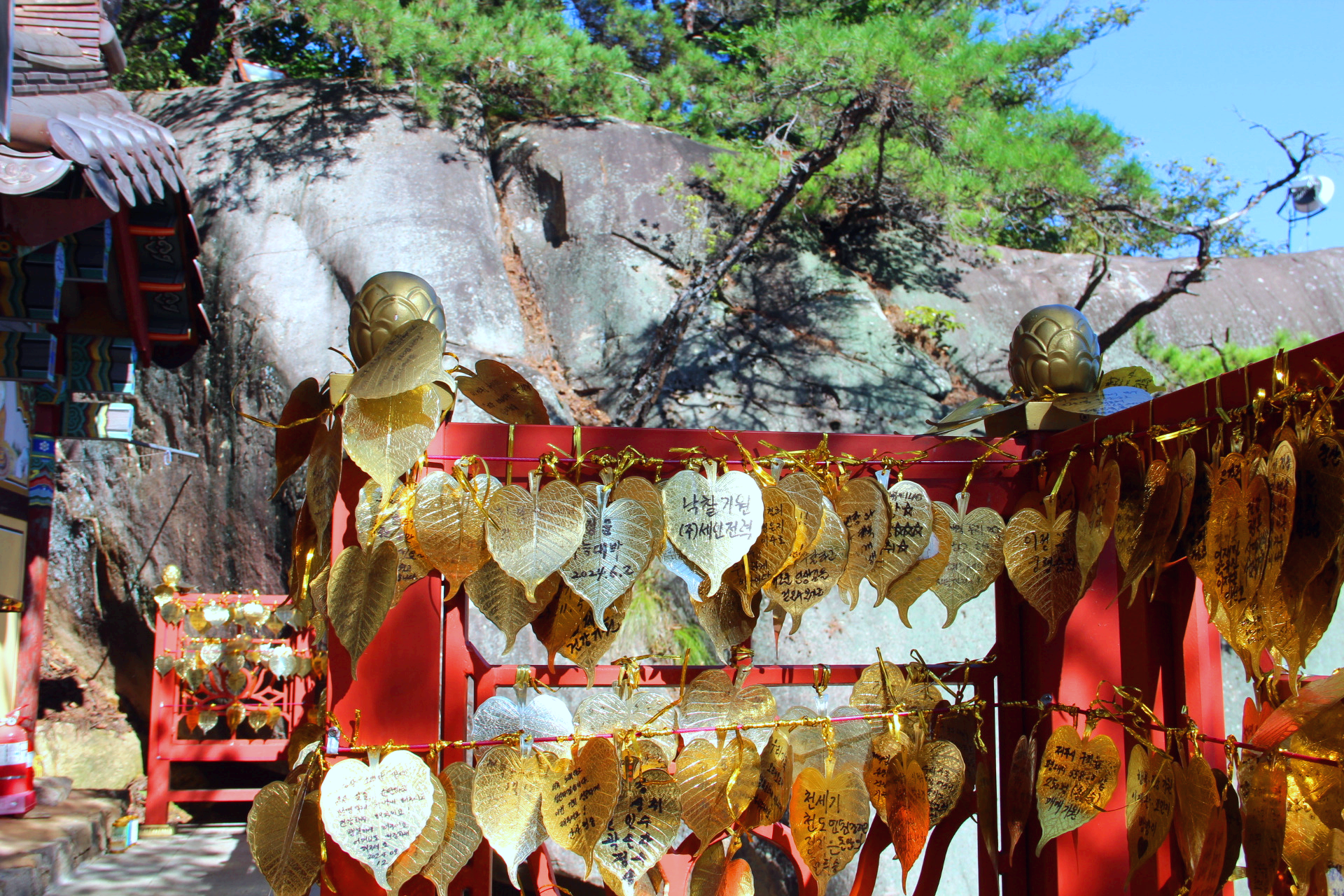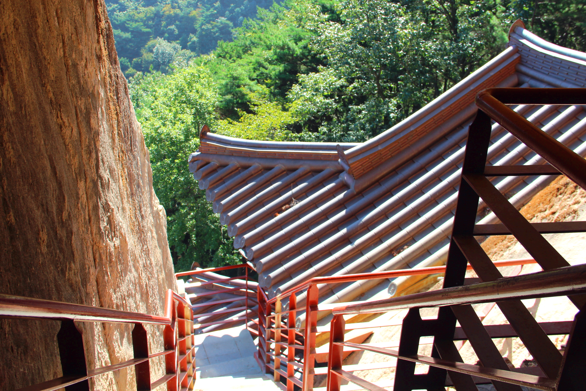 불굴사 옆 소나무 길을 따라 오르면 천년송이 뿌리를 내린 암반에 절묘하게 세워진 홍주암이 있다.