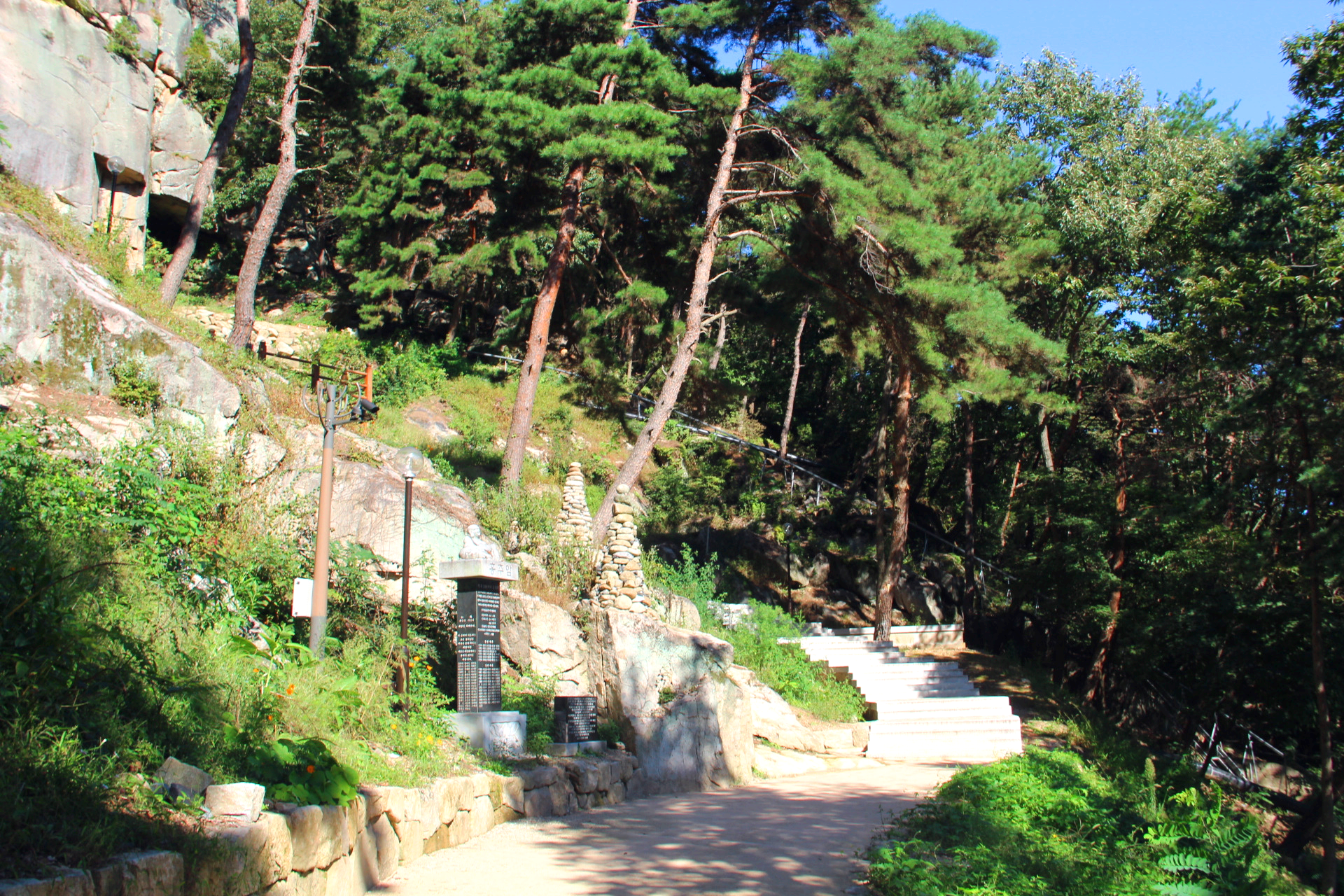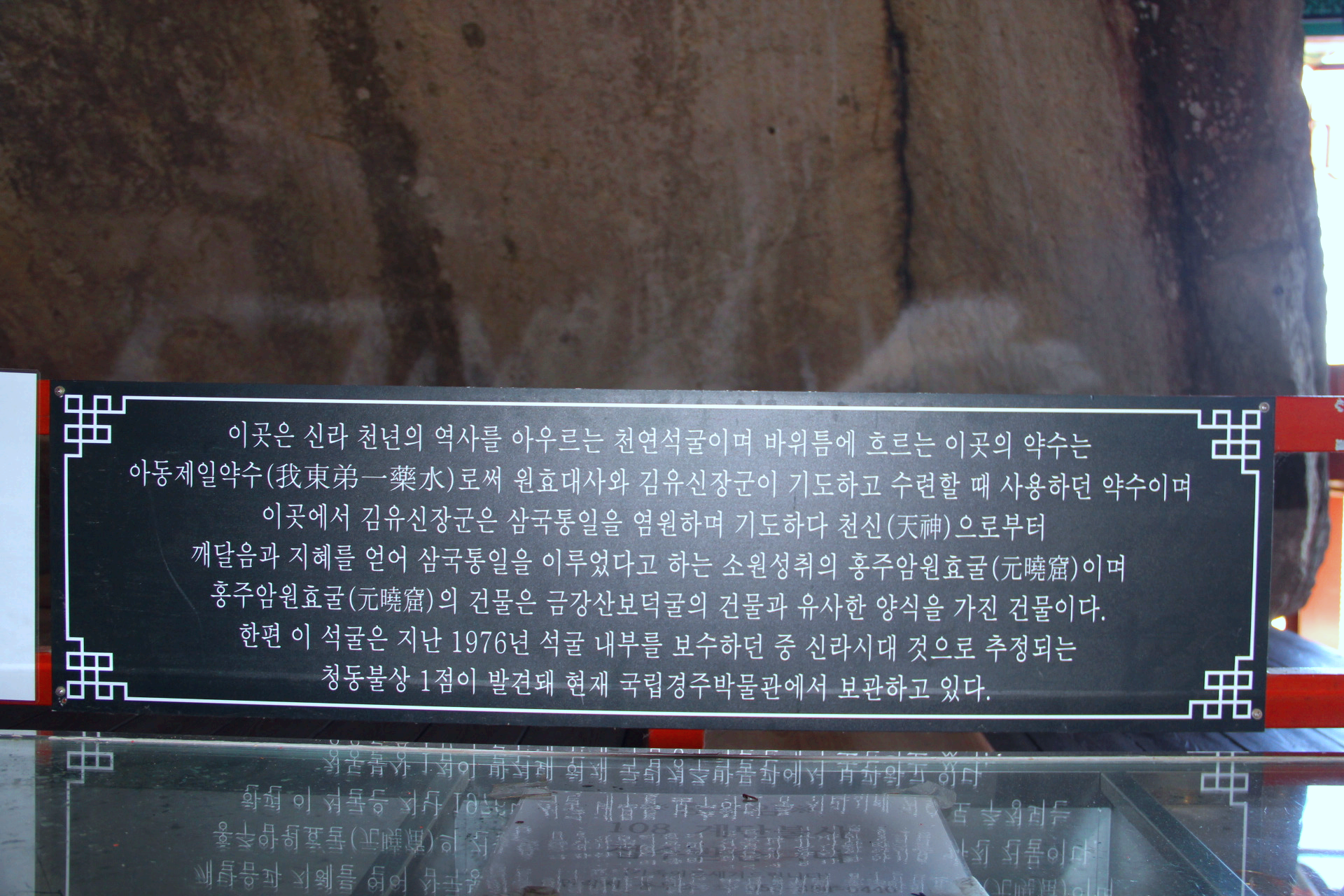 경사진 산길과 계단을 조금 오르다 보면 작은 굴이 나온다. 원효대사와 김유신이 기도하며 마셨다는