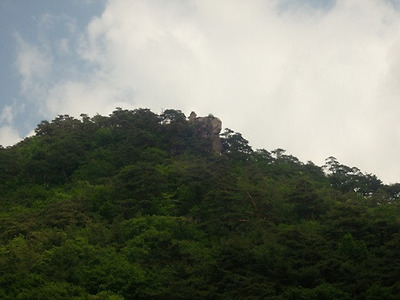 사불전에서 바라본 사불바위. 삼국유사에 따르면 “죽령 동쪽 백리쯤 되는 곳에 높은 산이 우뚝 솟아 있고, 진평왕 9년 정미(丁未)에 별안간 사면이 방장(方丈)만 하고 사방에 여래가 새겨진 일대석(一大石)이 붉은 비단에 싸인 채 하늘로부터 산정(山頂)으로 떨어졌다”고 한다.
