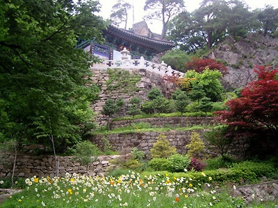 암자가 온통 꽃밭이다. 일년내내 꽃피고 새 노래하는 극락 화원이련가? 비구니 스님들의 지극한 불심이 꽃으로 만개한 듯하다. 멀리 보이는 윤필암 사불전은 진신사리를 봉안한 적멸보궁 처럼 부처를 모시지 않고 사불산 정상의 바위를 바라볼 수 있도록 유리 창을 내었다.