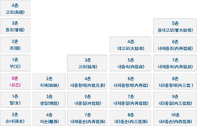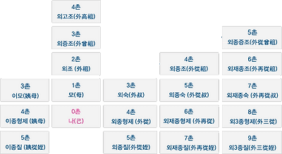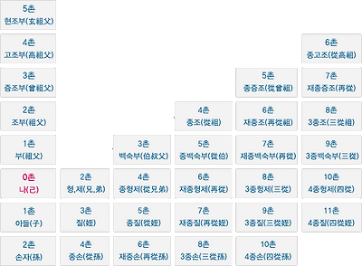 고조 ㅣ 증대고모---------------------------증조-----------------------------증증조 ㅣ ------------------- ㅣ --------------- ㅣ ㅣ ㅣ ㅣ ㅣ ㅣ 내재종조 대고모 조부모 종조 재종조 ㅣ ㅣ -------- ㅣ ------- ㅣ ㅣ ㅣ ㅣ ㅣ ㅣ ㅣ ㅣ ㅣ 내재종숙 내종숙 고모 부모 백,숙부모 당숙 재종숙 ㅣ ㅣ ㅣ ㅣ ㅣ ㅣ ㅣ 내3종 진내제종 내종 나 4촌종 재종 3종