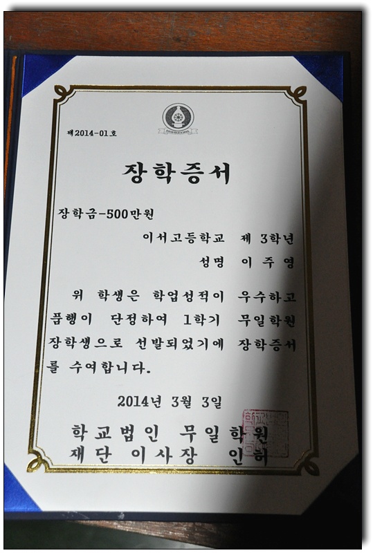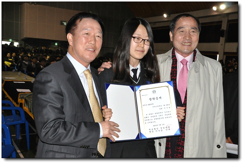 이서고등학교에서 매년 학기마다 1등을 하여 학기마다 500만원의 장학금은