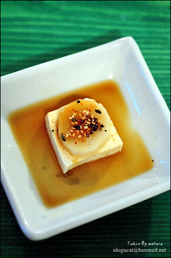 에피타이저로 두부에 감자를 얹은 요리가 나옵니다. 간편히 깔끔하게 먹어주기 좋겠습니다. 한 입에 쏘옥~