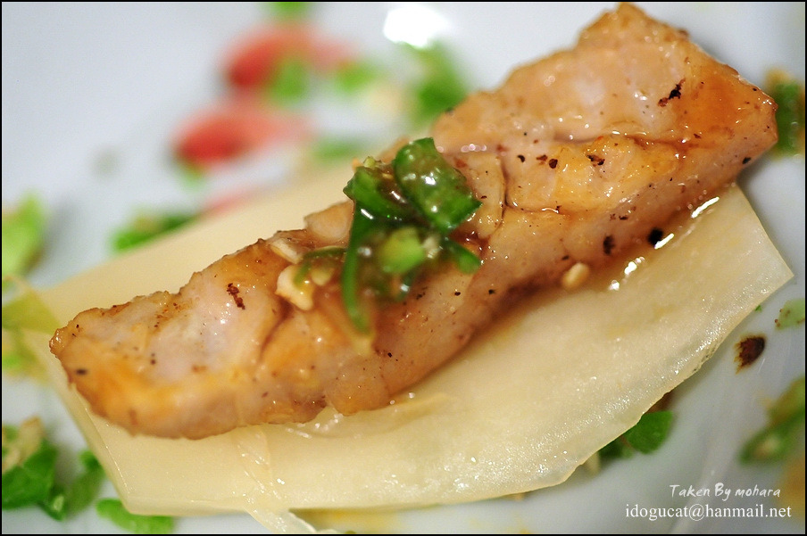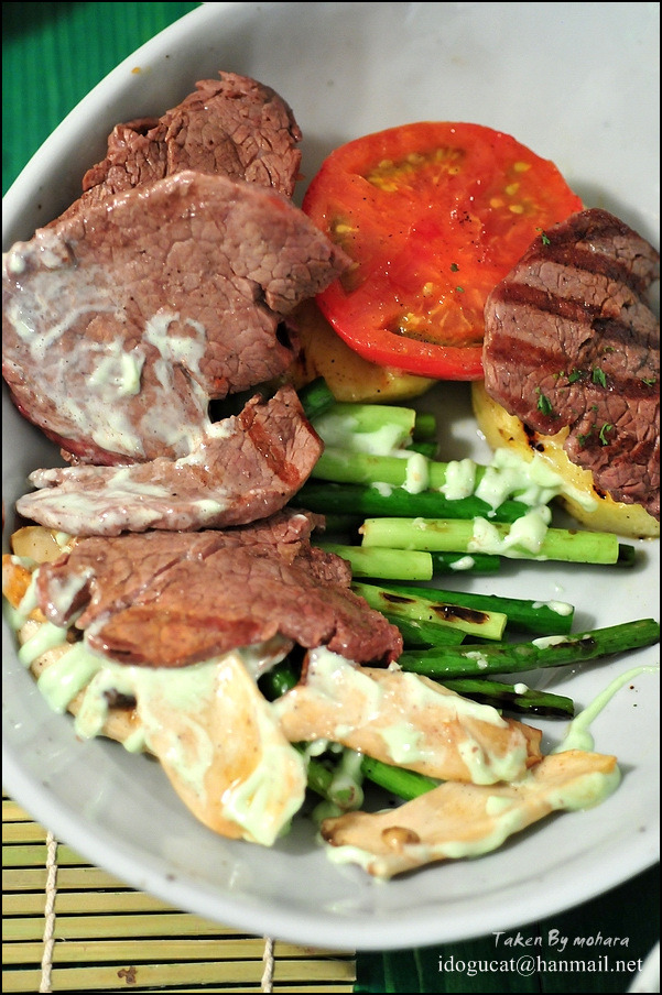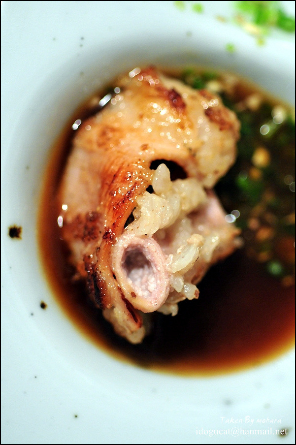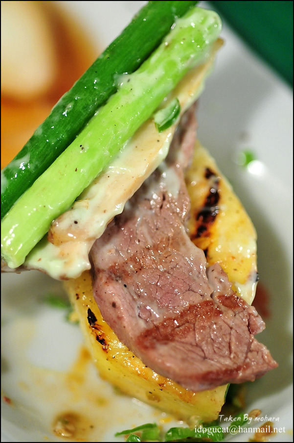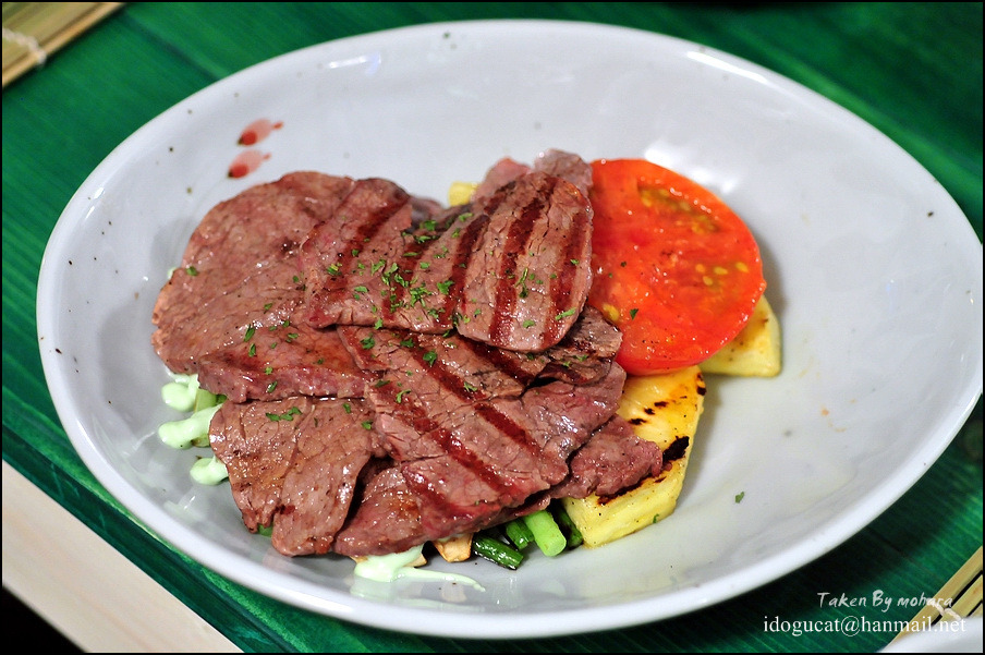 그릴에 구워진 자국이 선명히 보이는 안심이 얇은 듯 싶지만 그 정도의 두께가 먹기가 딱 좋은 듯 부드럽고 연해 식사나 안주로 아주 그만일 듯. 이 메뉴는 곱창을 잘 못 드시는 분들을 위해 고안 되었다는 메뉴라는 군요. 그 밑엔 구운 파인애플과 토마토가 있는데 고기와 같이 드시기에 적당합니다. 그리고 생와사비를 갈아만든 드레싱에 버섯과 마늘쫑이 잘 어울려 안주로 드셔도 무방해 보이는 듯. 아무래도 160g이라고 보기엔 많은 양이라고 생각이 드는데 오픈 하신지 얼마되지 않아 더 많이 주신게 아닌가 생각이 들더군요. 하여간 푸짐하게 맛나게 먹었네요.