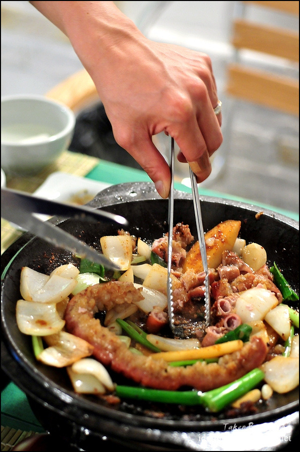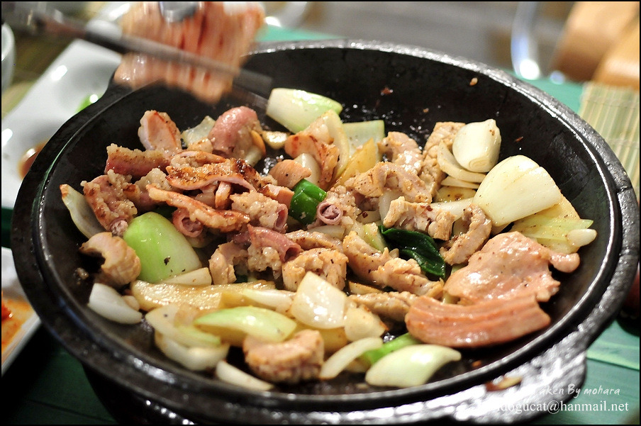 메뉴판에서 무쇠 철판 운운하던 것이 바로 이 불판이로군요. 중간에 활성탄이 들어있고 불판을 가열하여 오래도록 구워 먹을 수 있게 하죠.