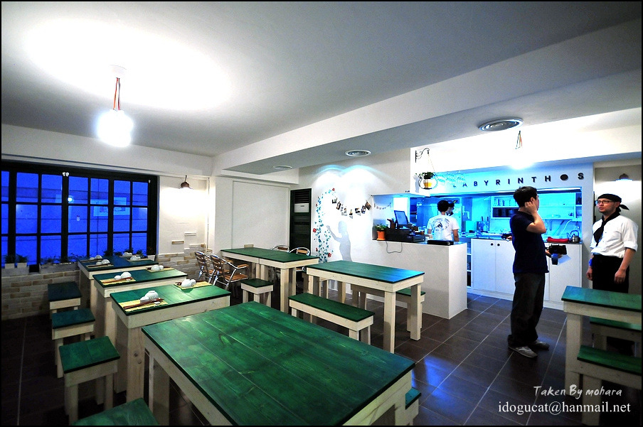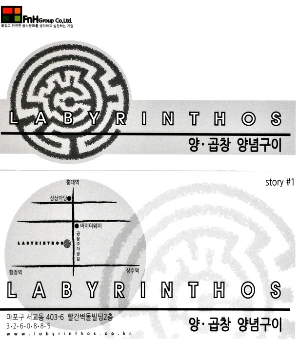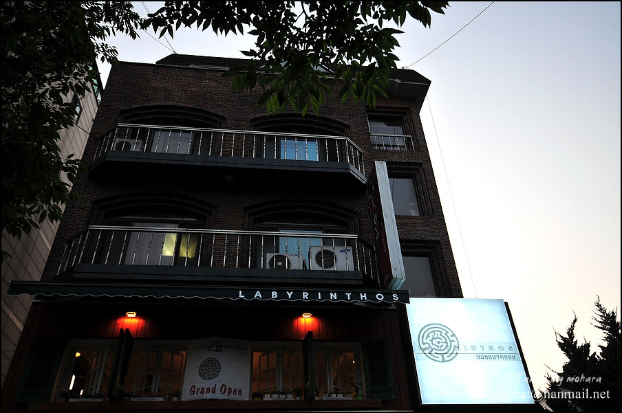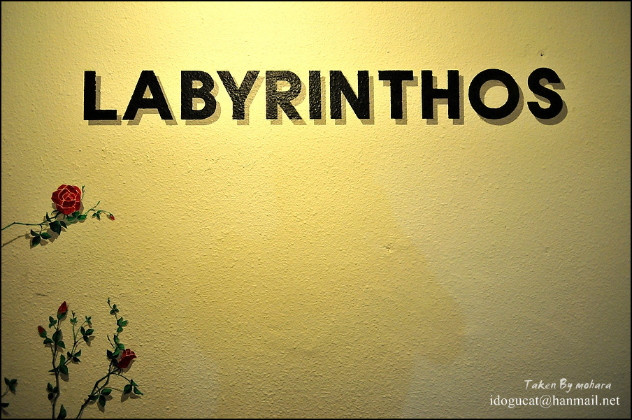 찾아가는 길이 쉽지 않더군요. 홍대 보다는 상수역이나 합정역에서 가까운 편인데 홍대주차장 골목을 따라 홍대 방향으로 가다가 상상마당이 나오기 전 오른편의 바이더웨이가 나오면 그 건너편 나무에 걸려 잘 보이진 않으나 2층에 보이는 라비린토스입니다.
